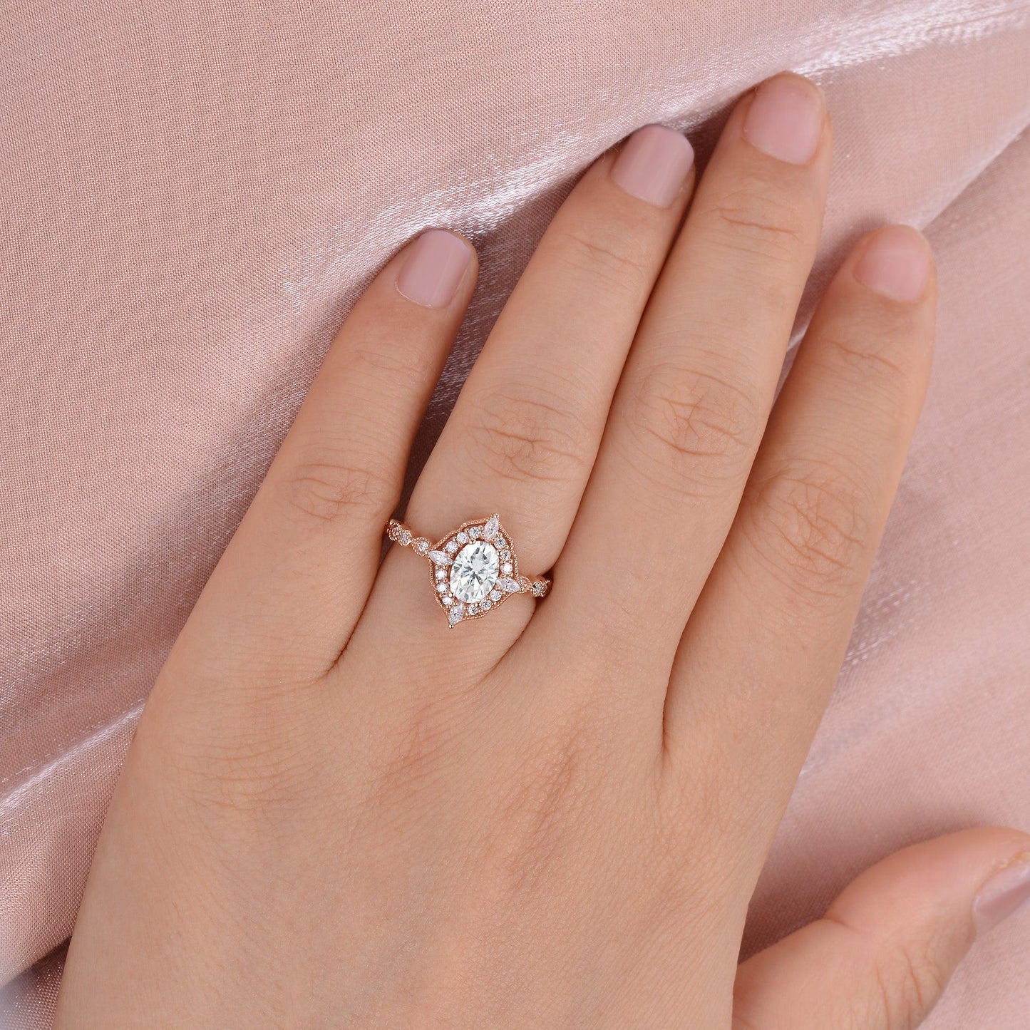 0.94 CT Oval Moissanite Diamond Vintage Halo Engagement Ring