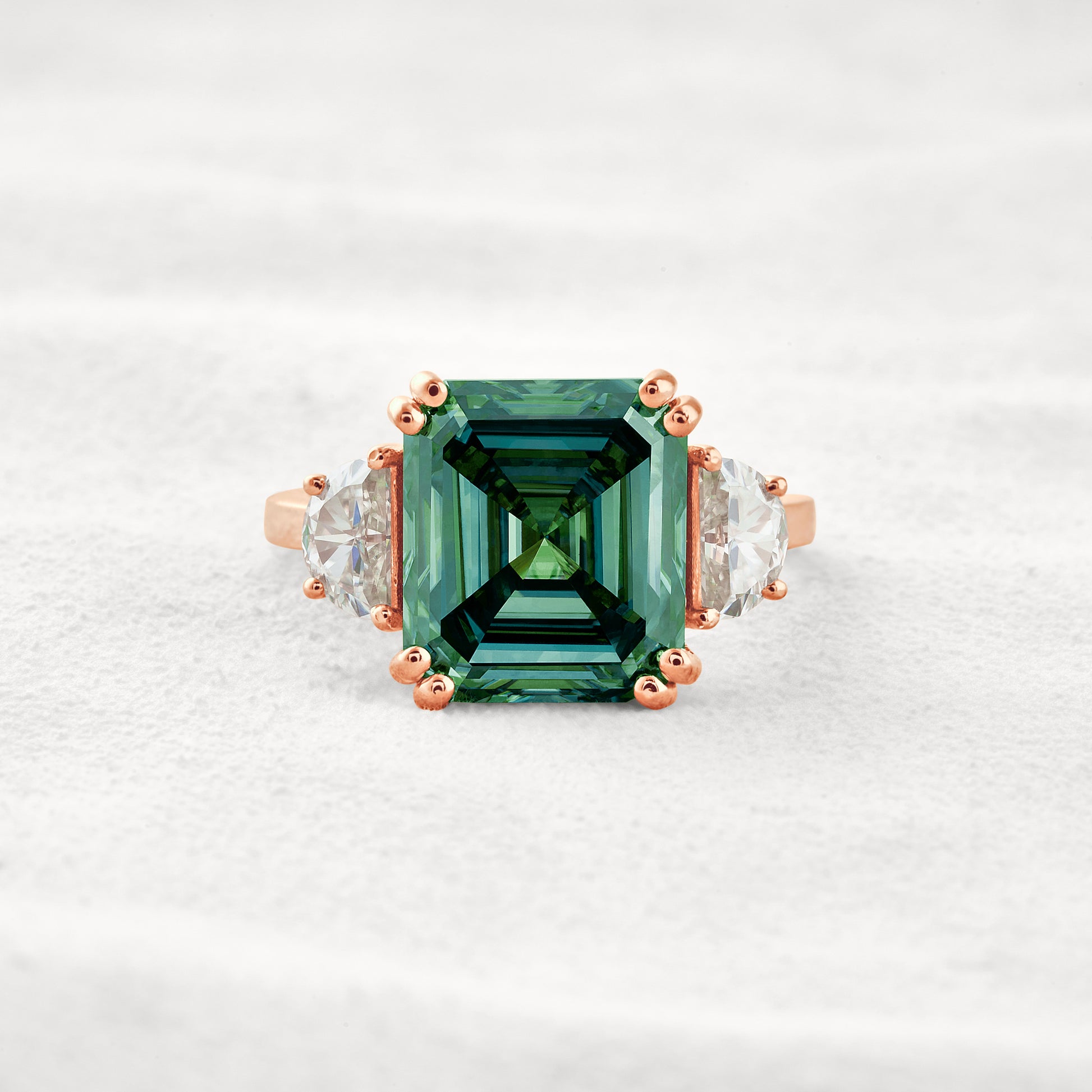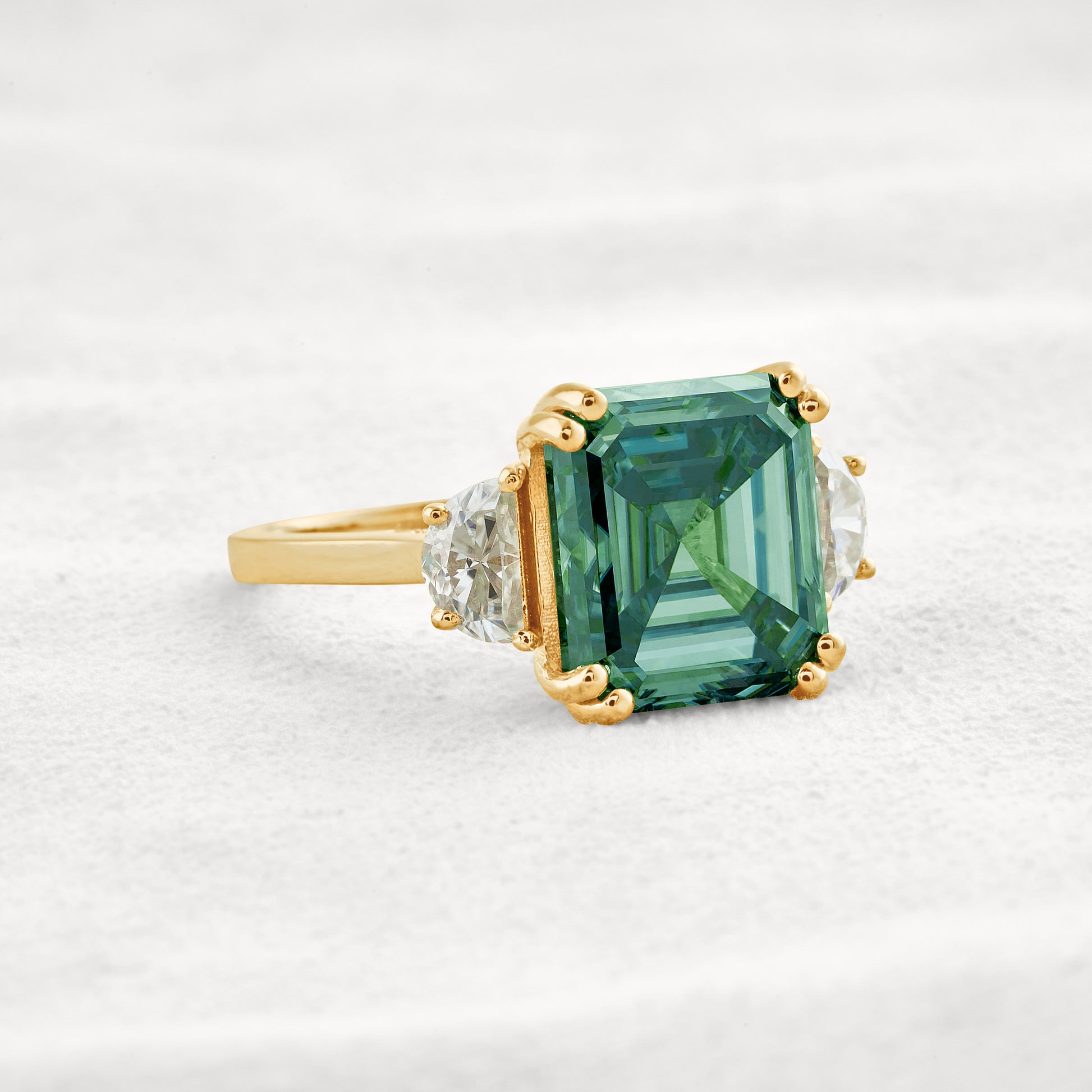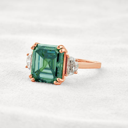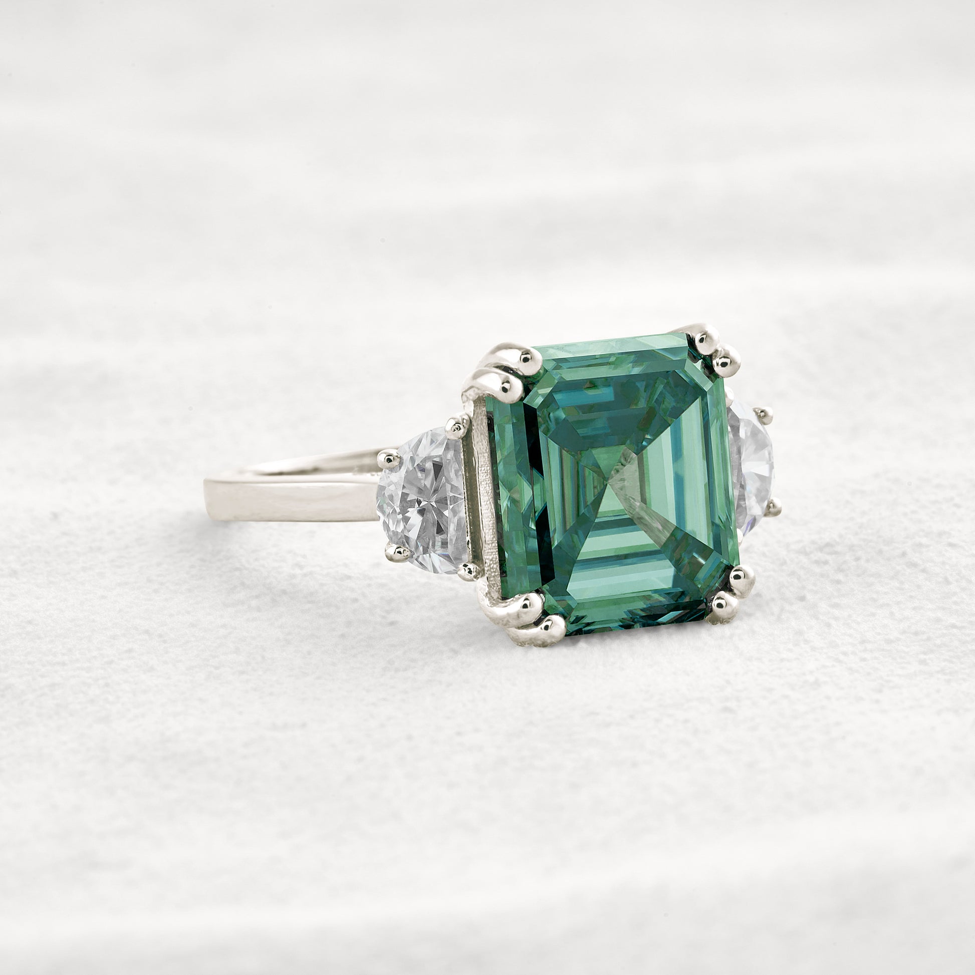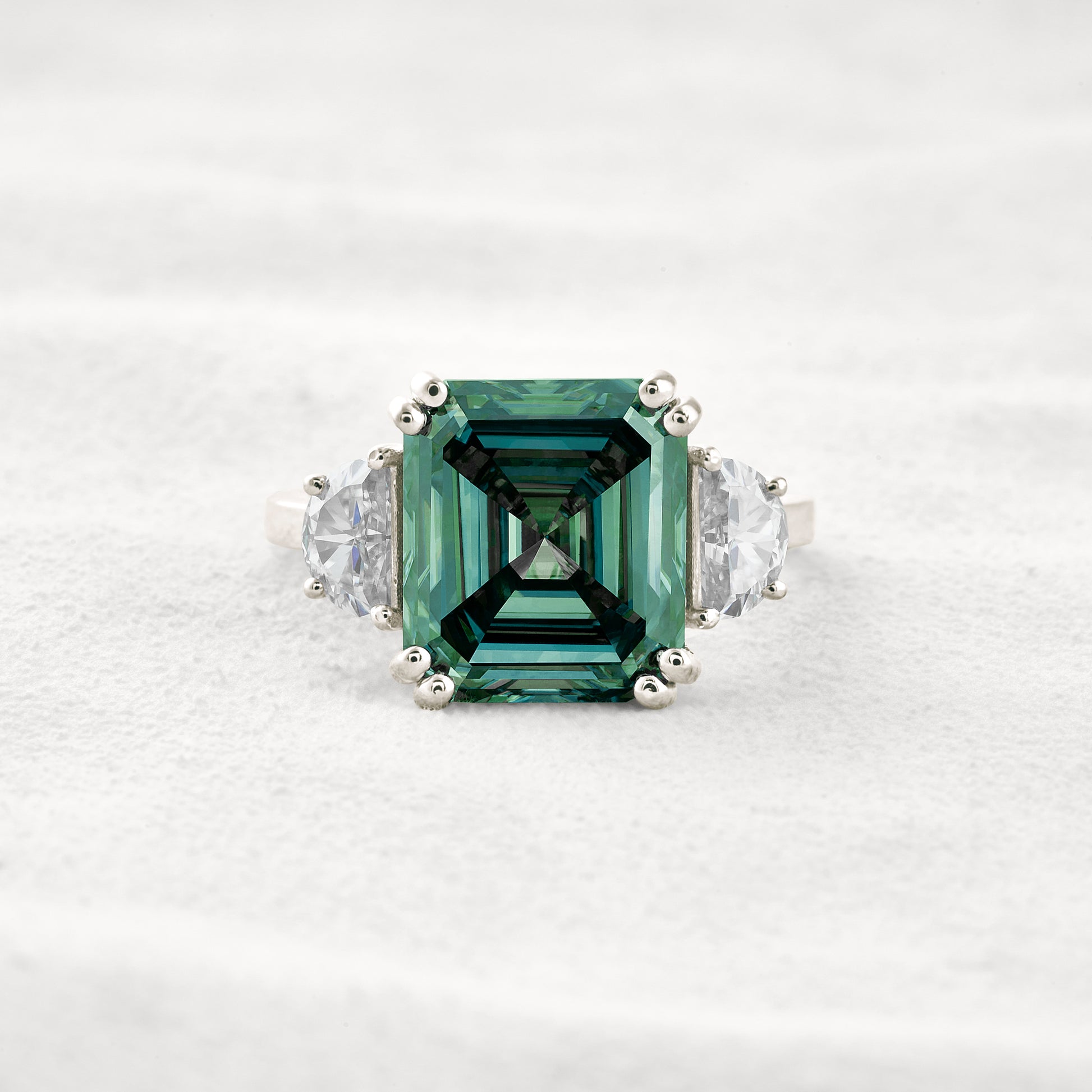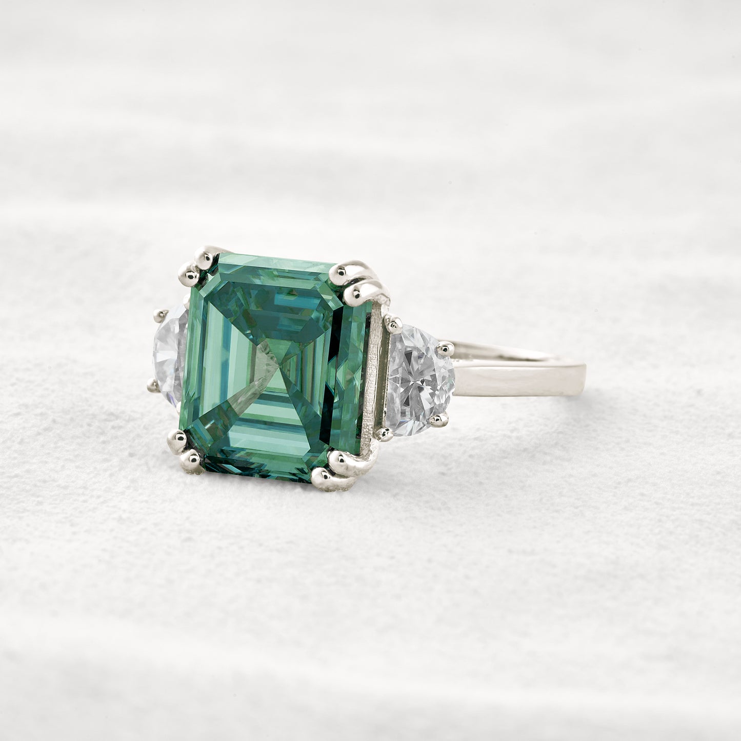 7.6 CT Blue Green Asscher 3 Stones Cut Moissanite Diamond Engagement Ring