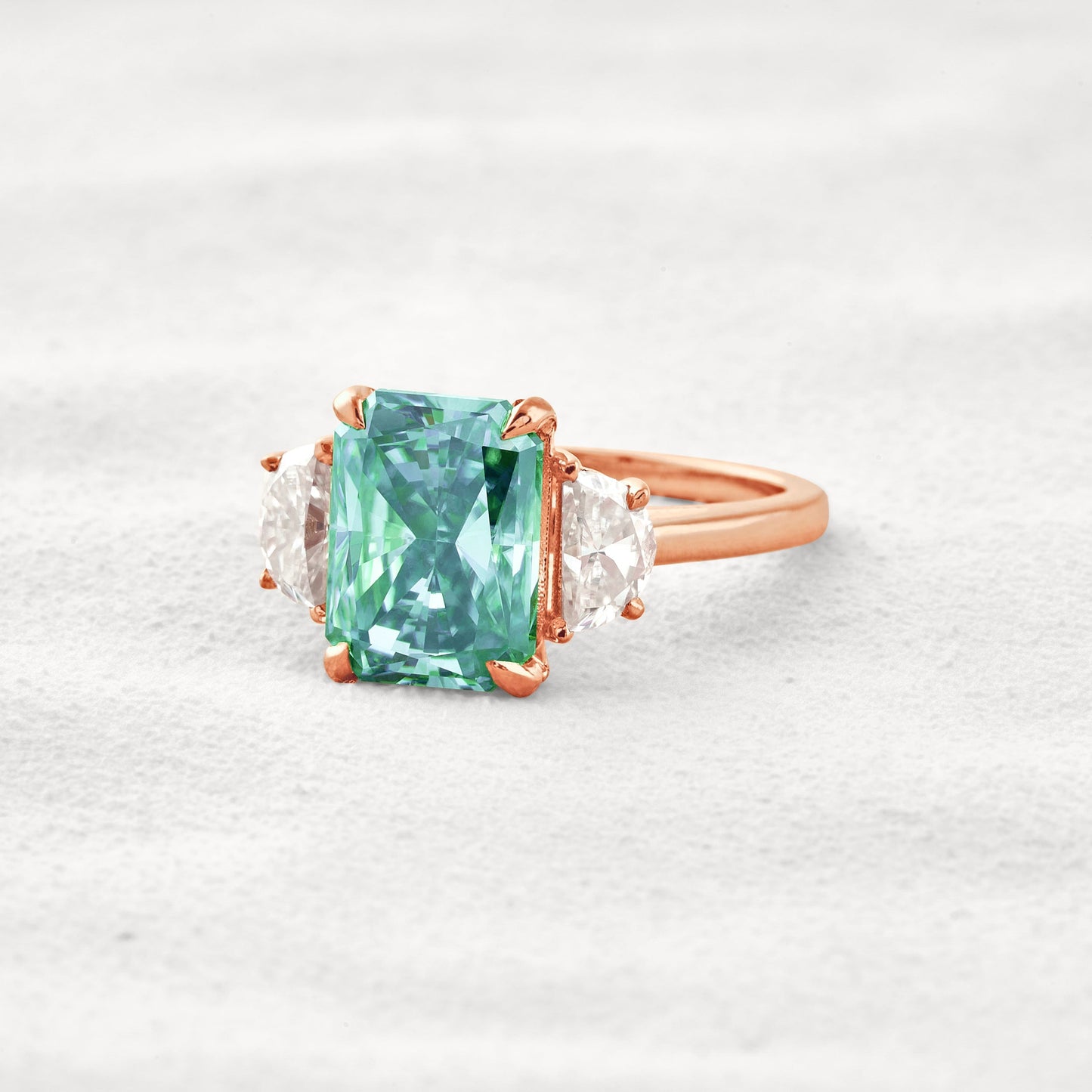 4.4 CT Blue Green Radiant 3 Stones Cut Moissanite Diamond Engagement Ring In Rose Gold